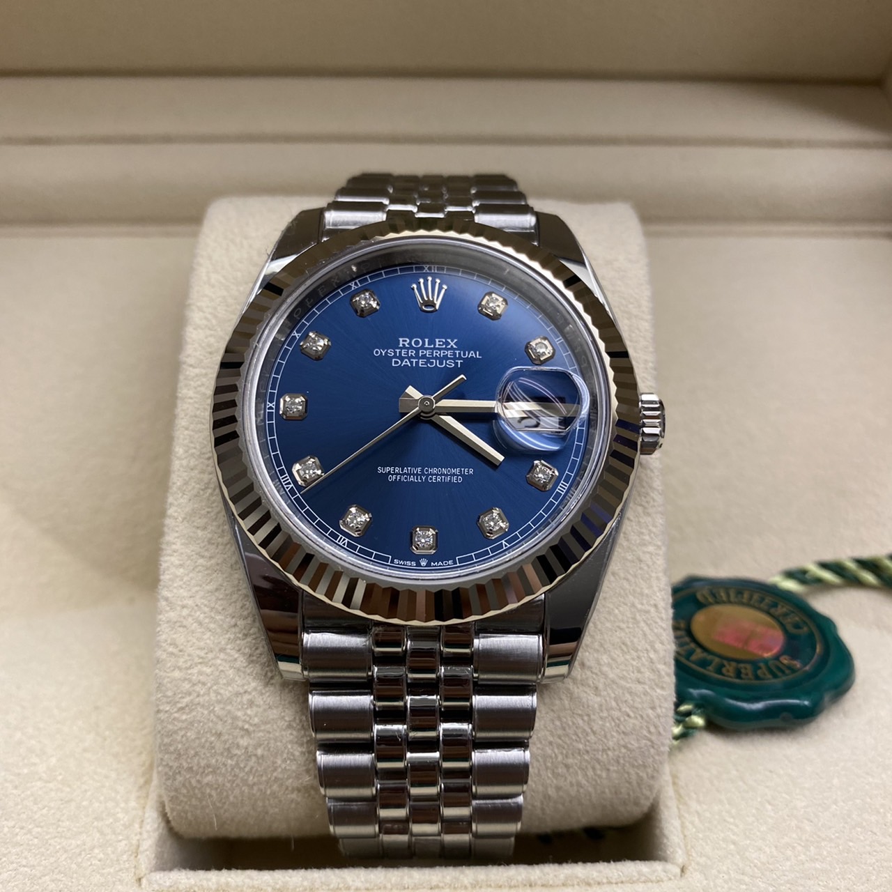 OYSTER PERPETUAL DATEJUST 41腕錶白色黃金及蠔式鋼款|搭配鑲鑽藍色錶面及紀念型(JUBILEE)錶帶|RX8全膜