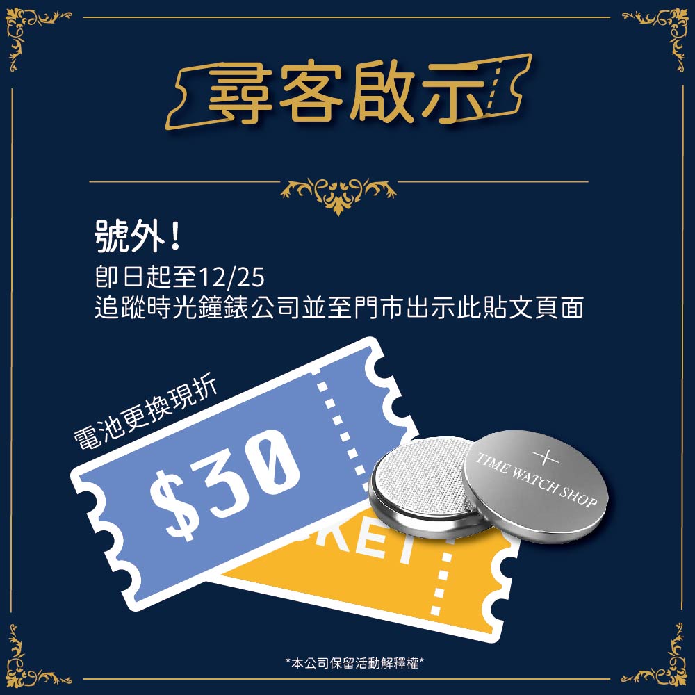 即日起至12/25,追蹤時光鐘錶公司並向門市人員出示此貼文頁面