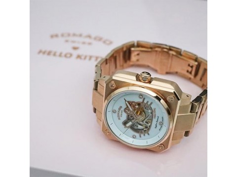 精鋼鍍玫瑰金方型錶殼氣派十足,錶面鑲有鑽石,與HELLO KITTY雍容華貴的結合可謂天衣無縫! 透視設計更是全方位一睹鏤空瑞士製自動機芯的無瑕細緻;加上防水深度達50米,彰顯ROMAGO SWISS對機芯頂尖品質的一絲不苟。 - ...
