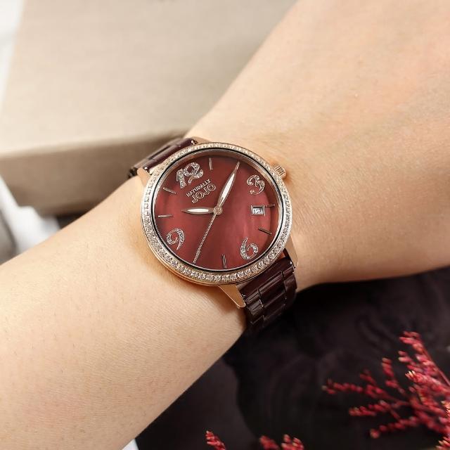 設計特色 :  錶面採用珍珠母貝製成,在不同光線下自然顯現不同色澤,在3/6/9/12刻度以水鑽點綴與日期窗設計。