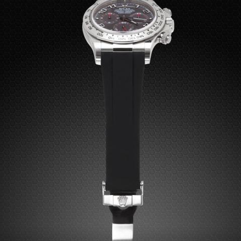 硫化橡膠錶帶設計適合勞力士迪通拿錶帶錶殼和展開式表扣(僅限勞力士機芯),錶殼具有“塊狀集成”,可實現完美、無旋轉的安裝。注意:不 兼容帶有 OysterFlex 橡膠錶帶的新版 Daytona 。牡蠣手鍊版本也不兼容。