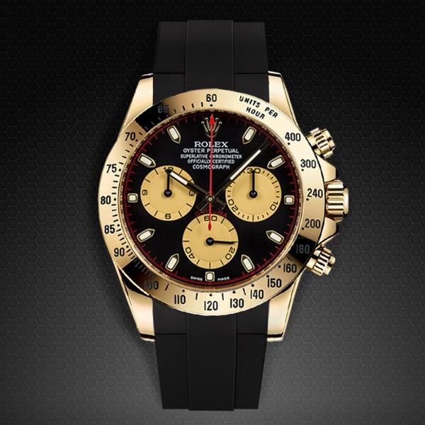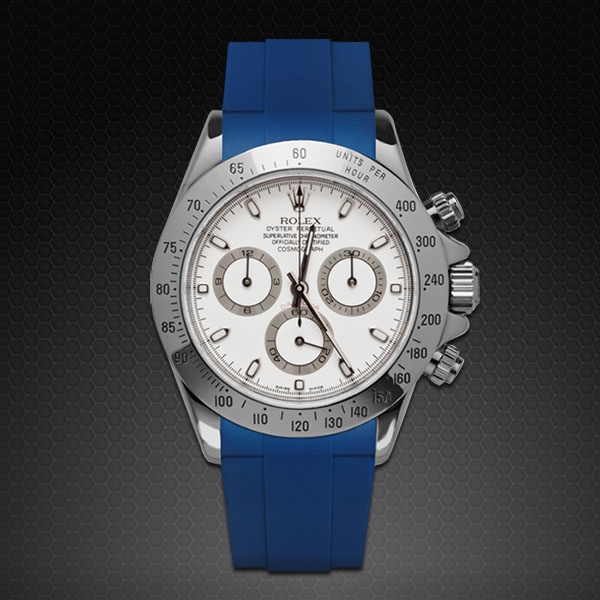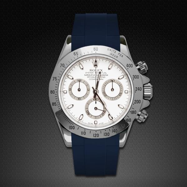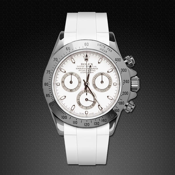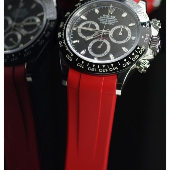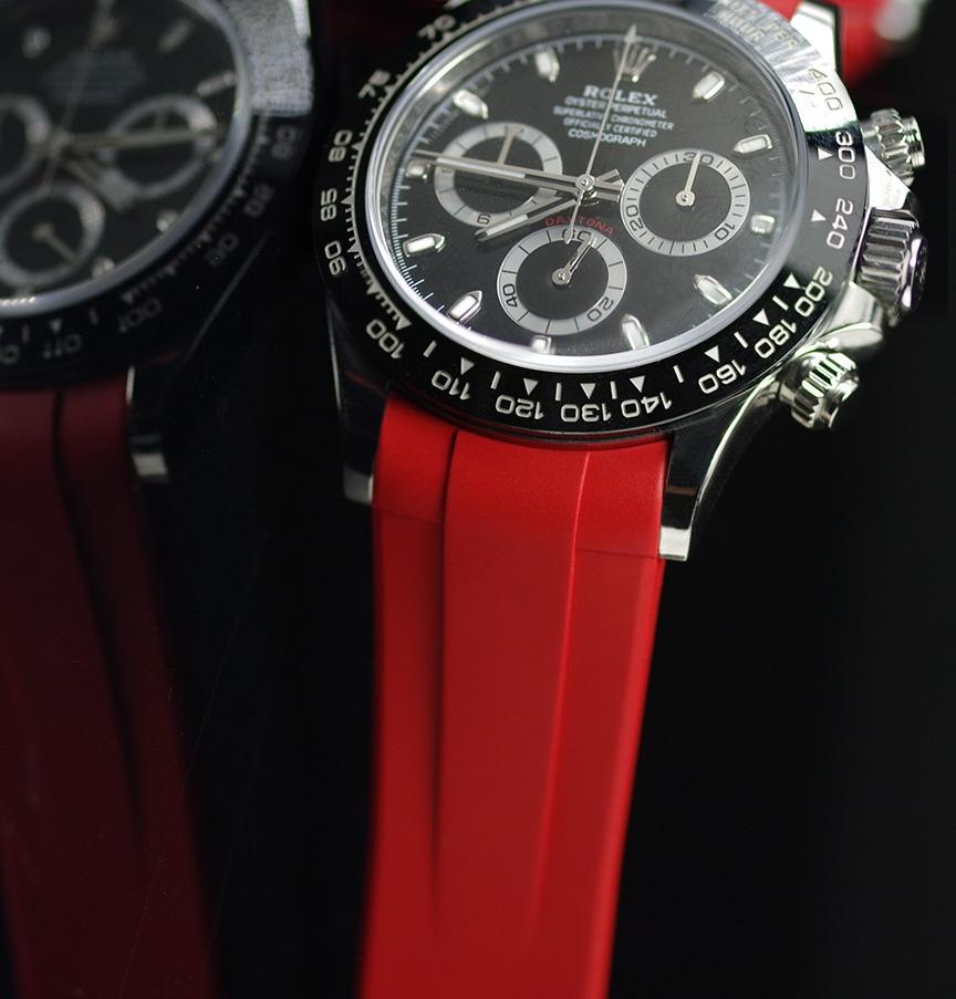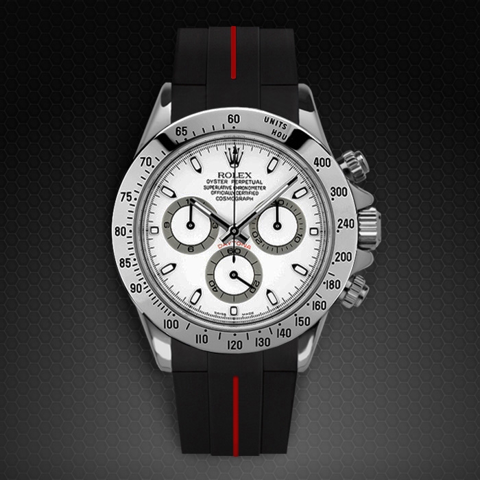 Vulcarbonized 橡膠錶帶搭配 316L 不銹鋼 TANG BUCKLE 設計,適合勞力士 SS 或 黃金 Daytona 錶殼*。(不兼容白金或玫瑰金版本。也不兼容 Oysterflex 手鍊型號)。這款錶帶採用“Blocked Integration”工程,結合實心嵌件,可完美、固定地嵌裝在 Daytona 錶殼上, 並採用橡膠 B 標誌性“T”設計。