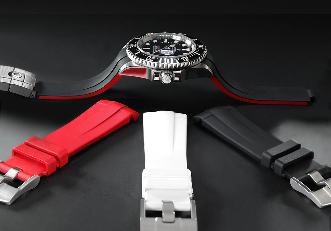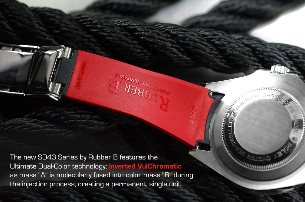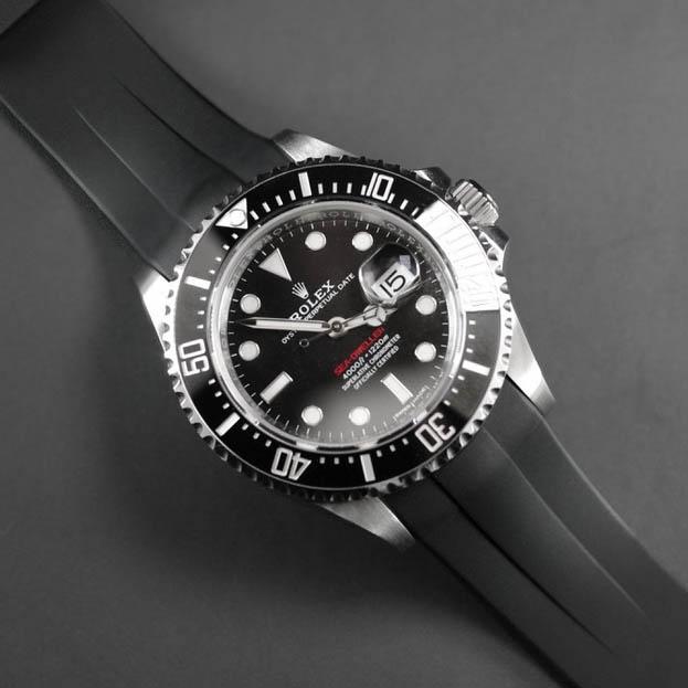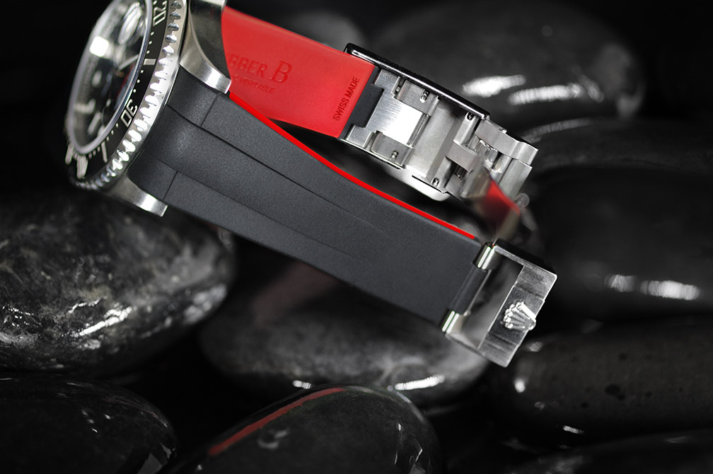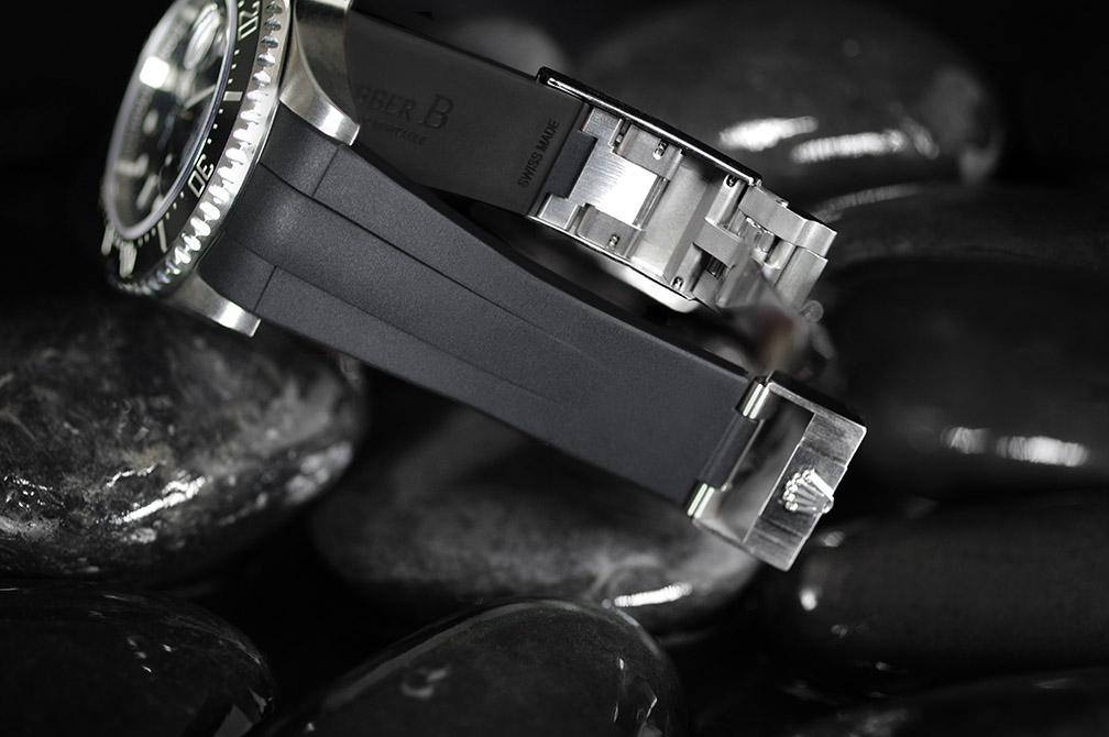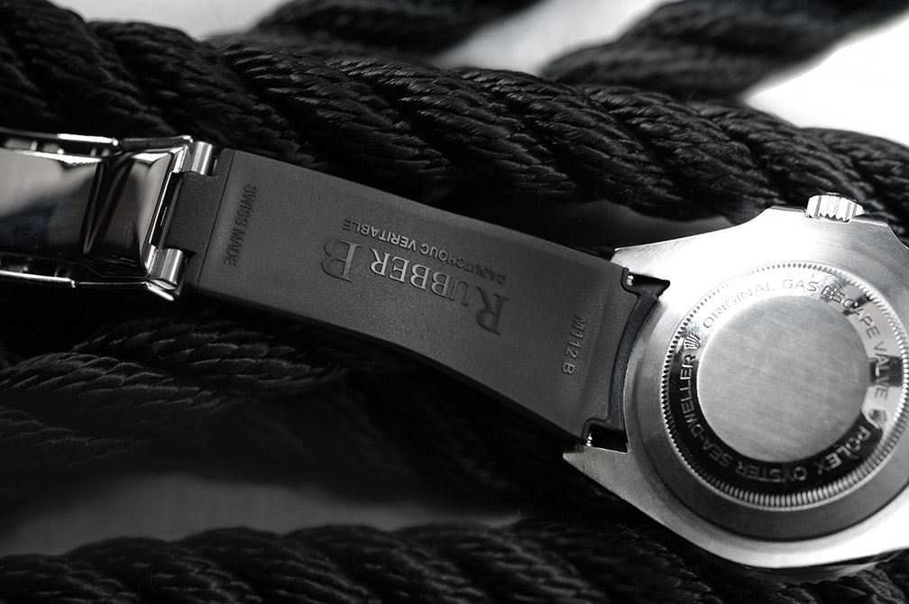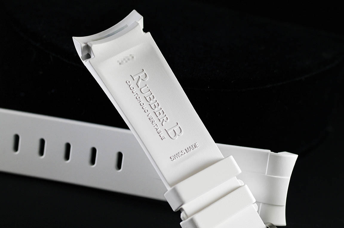 硫化橡膠錶帶經過精密設計,適合勞力士 Sea-Dweller 43 毫米。這款錶帶採用“Blocked Integration”工程技術,包括用於在 Deepsea 錶殼上實現完美、靜止的嵌入式安裝的實心插件。