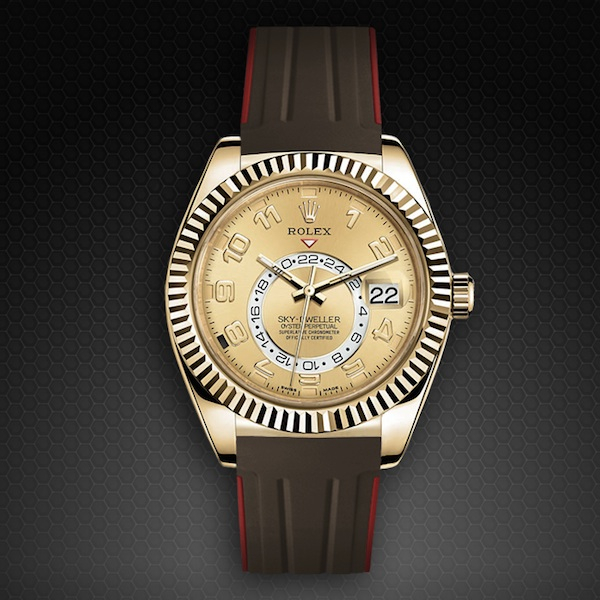 硫化雙色橡膠錶帶設計適合勞力士 SkyDweller 和 Oyster Deployant 帶扣*(不兼容金錶鍊版本。僅兼容最初配備鱷魚帶的 SkyDweller 版本)。這款錶帶採用“Blocked Integration”工程,結合實心嵌件,可完美、靜止地嵌裝在錶殼上。