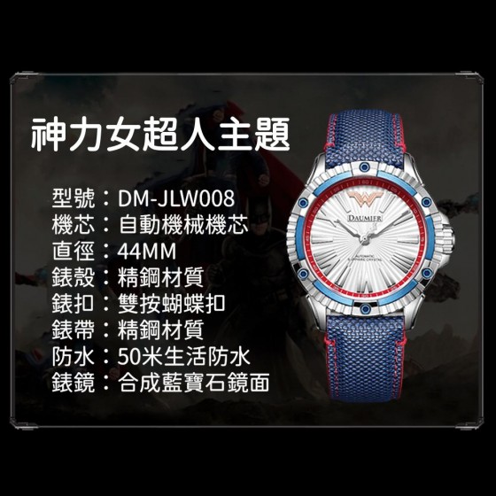 作為正義聯盟超級腕表的開發專家,DAUMIER設計師們希望通過「超級英雄都應該戴表」理念呼籲「正義聯盟」部分沒有佩戴腕表習慣的忠實粉絲們,能在佩戴「超級腕表」的同時體會到在現實中,我們都需要變身,成為生活中的英雄,在不同場合佩戴不同規格的手錶,展現時尚及專業的不同身分。DAUMIER丹瑪聯乘正義聯盟的亮點圍繞「現實生活中的超級英雄」為主題,完成了JUSTICE LEAGUE腕表設計及生產的艱巨任務。作為腕表界的創作先鋒,DAUMIER確切地實現了GGV品牌價值:G-good design 優質設計G-good Quality 品質優良Value for Money 物超所值優質設計、品質及物超所值的理念,把佩戴腕表的習慣重新定義,同時執行屬於國際品牌、企業的社會責任。