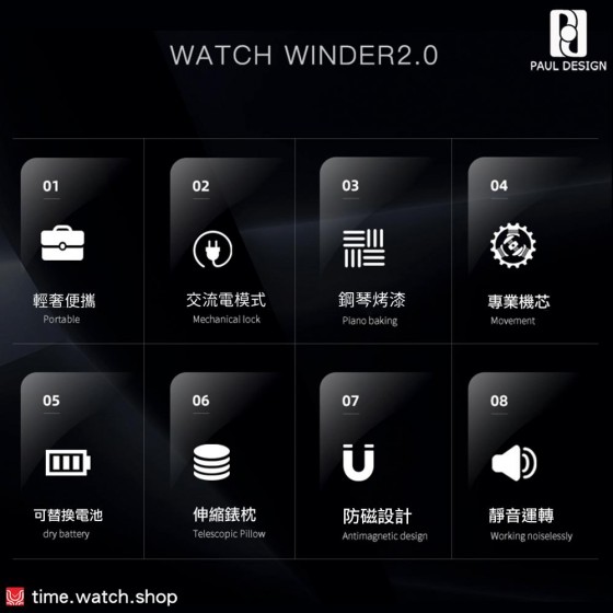 專業級別上鍊機芯,外表採用鋼琴烤漆,內裡搭配頂級皮革材質,兩種供電模式,錶架採用兩段式伸縮行錶架,產品採用按鈕是調節,小巧便攜,操作簡易。