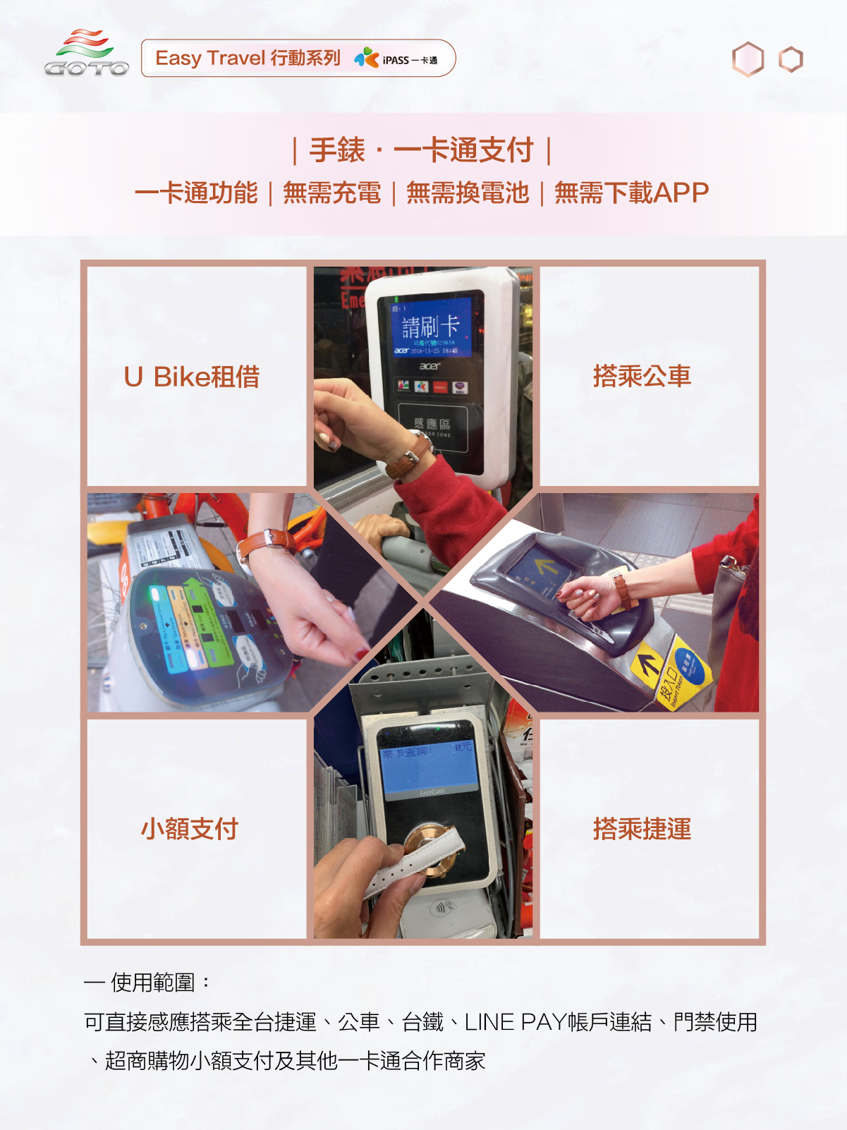 特點一:無需開卡或是下載APP,行動手錶相當於一張一卡通之普通卡,手錶錶面即為感應面,消費者購買後直接儲值金額,即可直接使用。
