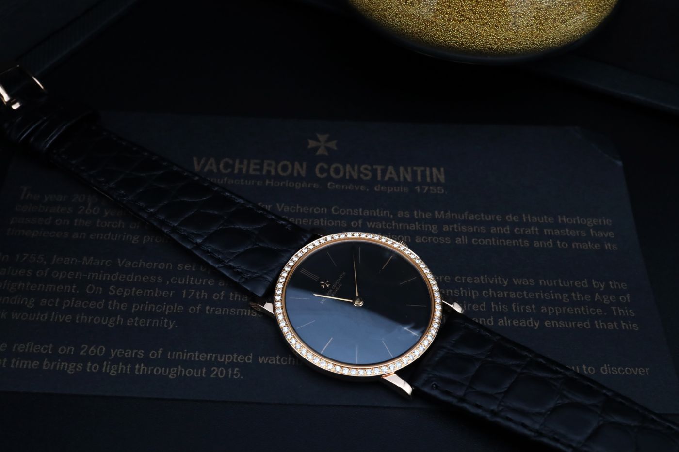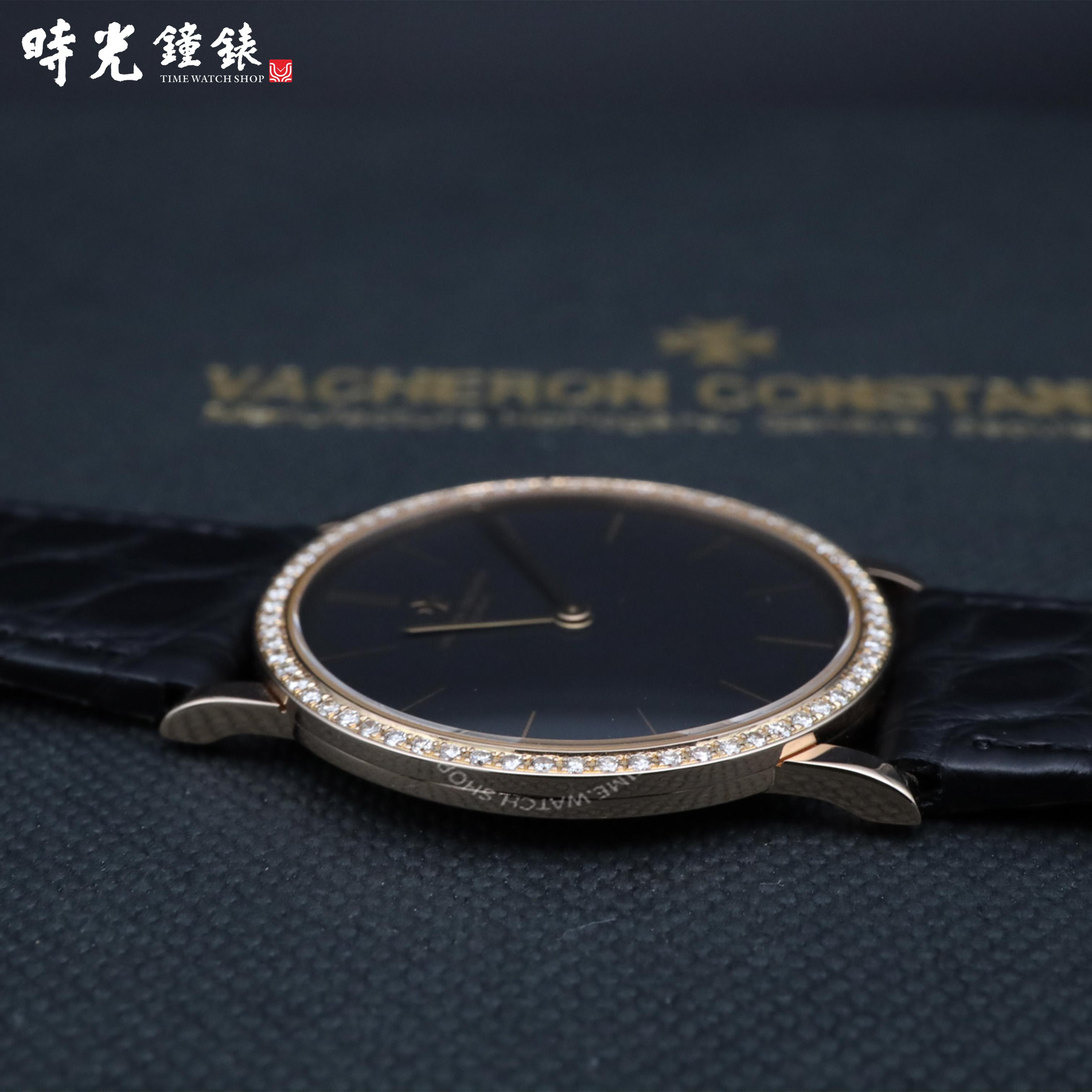 【材質】:玫瑰金材質錶殼及馬爾他十字穿帶錶扣 / 原裝鑽圈 / 立體鑲嵌時標 / 黑色面盤 / 黑色鱷魚皮錶帶 / 藍寶石水晶玻璃鏡面 / 表殼厚度僅6.79mm