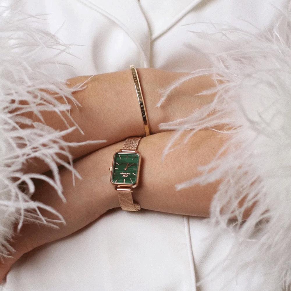 全新Quadro方錶系列是Daniel Wellington首次方形設計腕錶,錶身採用拋光不銹鋼製成,精緻的玫瑰金或是極光銀兩種錶身選擇。別緻的方形錶面有蛋殼白、經典黑和伯朗大道綠三種款式,搭配新型的麥穗式金屬編織錶帶或是細緻的壓邊皮革錶帶,讓妳的造型更為出眾,成為眾人的目光嬌點!
