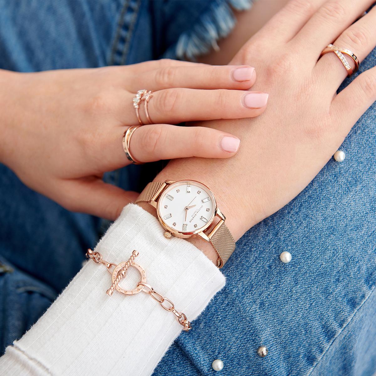 Olivia Burton London 純白錶盤綴以晶透感十足的晶鑽刻度,增添 Bejewelled 系列迷人輕奢感,造型亮眼之外,更要加倍閃耀妳的每日穿搭。