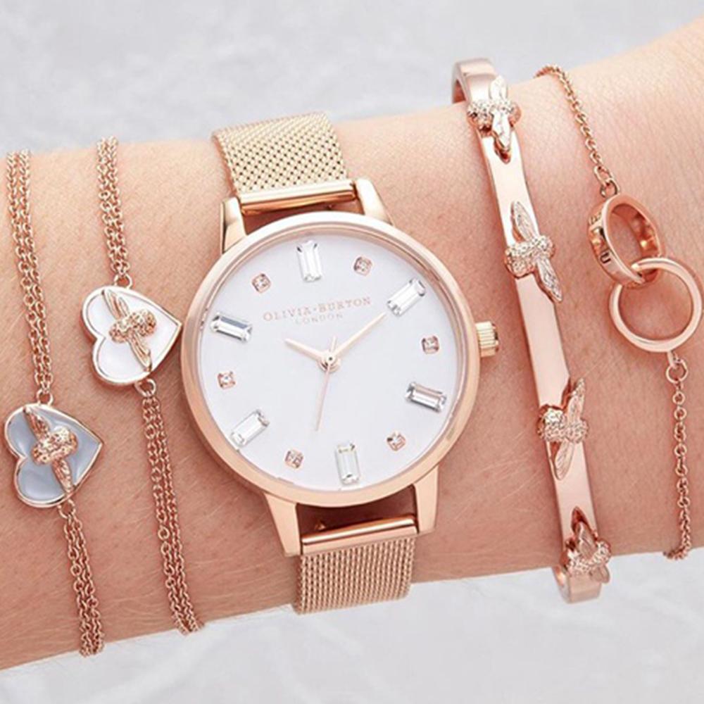 Olivia Burton OB16BJ02 玫瑰金殼白面不鏽鋼米蘭腕錶