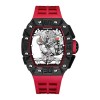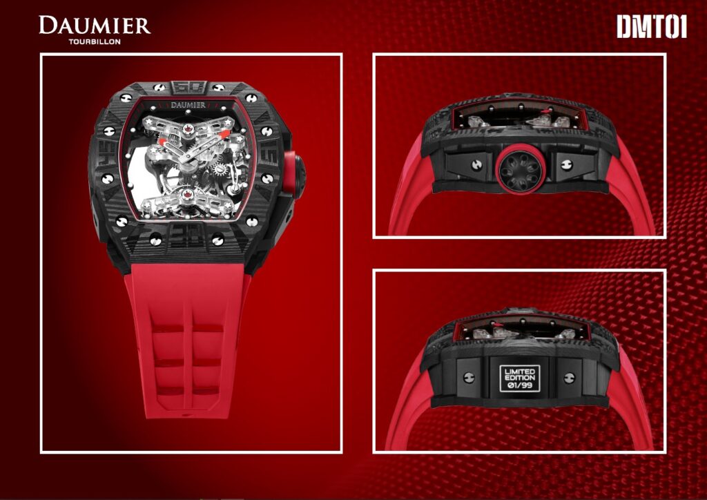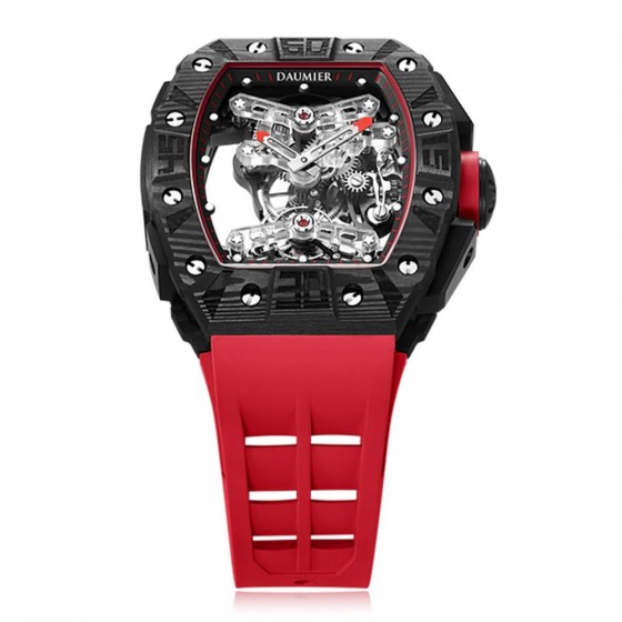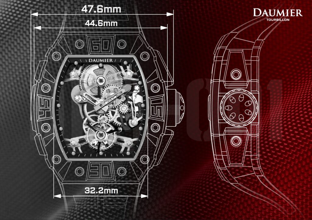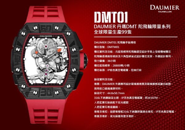 機芯資料及功能:高擺動頻率陀飛輪鏤空設計手動上發條機械機芯,陀飛輪透視劍形橋拱及六角型蜂巢式設計機芯支架,並獲得外觀設計專利