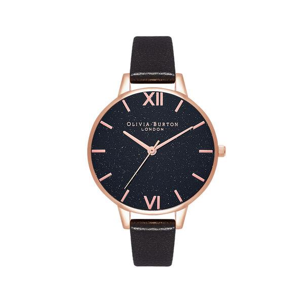 • Olivia Burton OBGSET158 玫金殼閃耀黑面皮帶腕錶搭玫金愛心手鏈套組