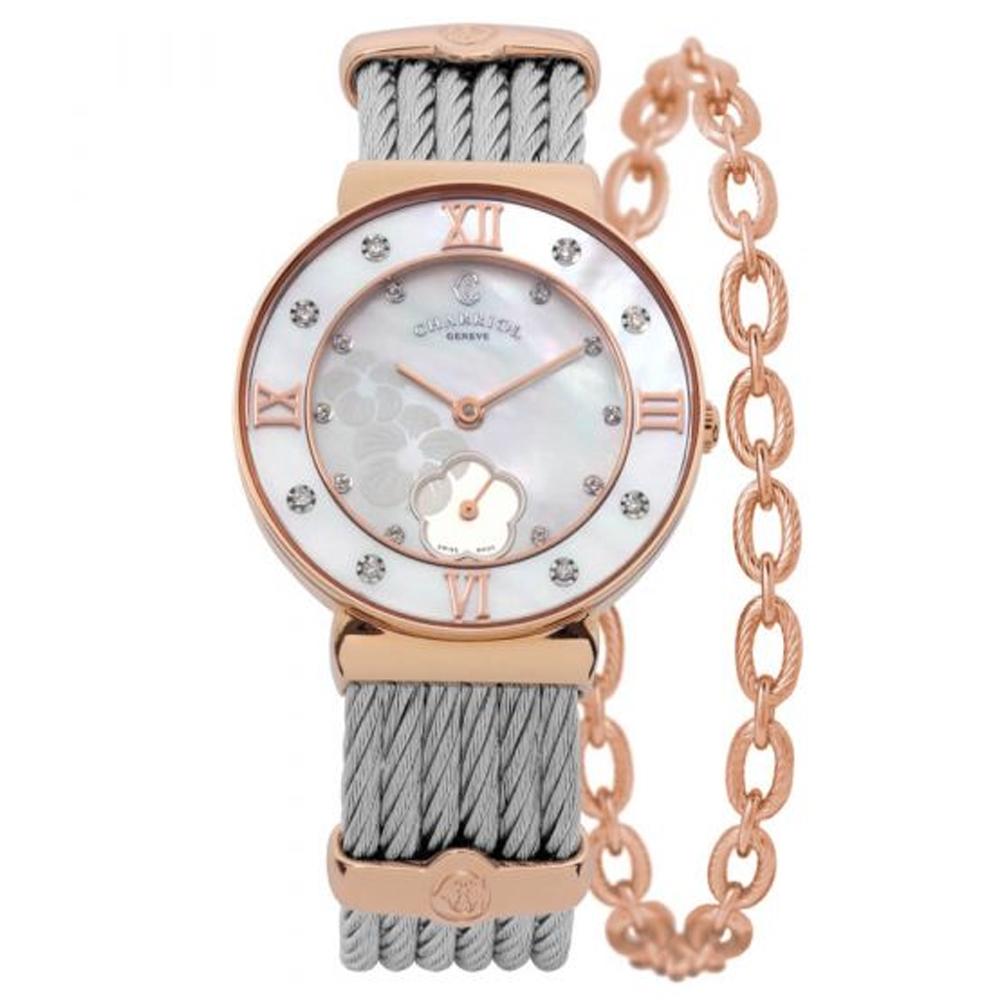 錶殼採用PVD金色拋光的不銹鋼材質,錶圈以羅馬字呈現,搭配0.05克拉的真鑽,為本就精緻的設計添上一抹華美氣息。