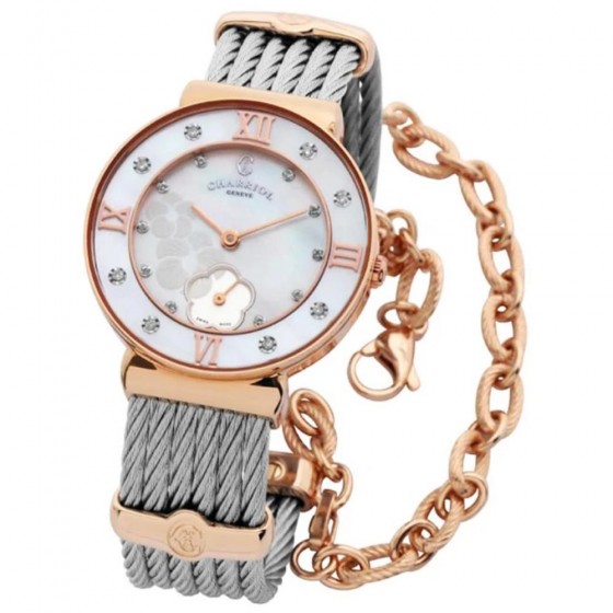 秒針盤以獨特的芙蓉花型呈現,設立在6點鐘的方向,白色珍珠母貝的面盤結合細膩的芙蓉花紋,在不同光線裡熠熠生輝。