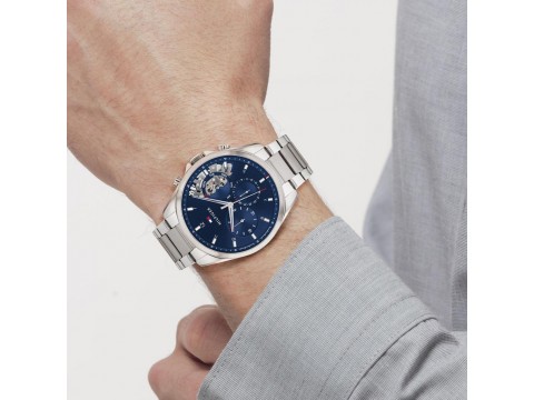 原廠保固兩年 【高雄時光鐘錶】Tommy Hilfiger 1710448 銀殼 藍面 三眼 鏤空 不鏽鋼 腕錶